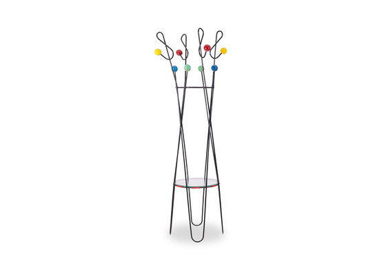 Roger Feraud, de. Perchero modelo "Clave de Sol" de metal lacado en negro, con bolas de madera lacada y coloreada, y su tapa redonda de cristal permite colocar un bolso. Obra francesa de los años 50/60. Dimensiones: Alto 178 x Fondo 51 cm. Referencia: LS6116535B