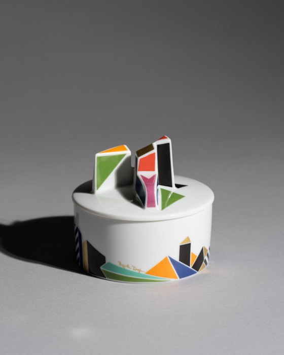 El cuerpo cilíndrico de porcelana está rodeado por un friso geométrico y definido en colores vibrantes pero equilibrados (turquesa, cobalto, ocre, negro, verde y coral), mientras que la tapa se convierte en un pequeño paisaje arquitectónico. Formas angulares y facetadas se alzan desde la superficie como un horizonte abstracto, transformando el acto de abrir la caja en un gesto táctil, casi ceremonial.