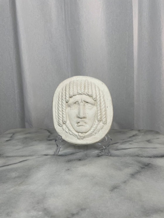 Bajorrelieve de escayola blanca que representa un rostro esculpido en relieve. Este rostro de inspiración antigua y expresión dramática recuerda a las antiguas máscaras de teatro.