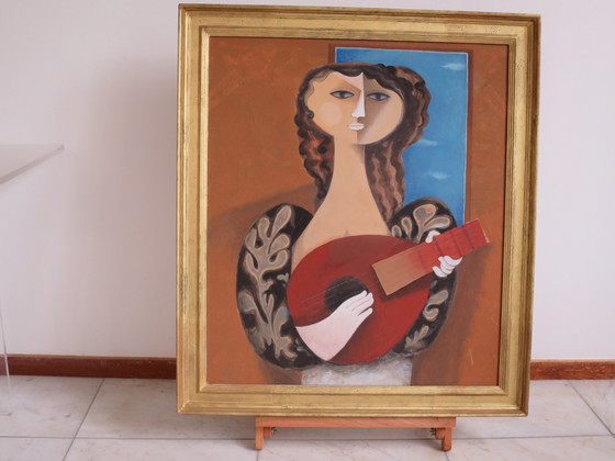 Olieverf op karton, afmetingen inclusief lijst. Sami Briss is geboren in 1929 in Briss, Roemenie. Dertig jaar later verhuisde hij naar Israel. In 1974 verhuisde hij naar Parijs, waar hij nog steeds woont.Als schilder verwerkt hij vaak het begrip nostalgie in zijn werk. Kindherinneringen worden vastgelegd dmv harmonie en gestileerde figuren.Zijn gebruik van bladgoud kan in verband worden gebracht met zowel de Joodse traditie als de Roemeense christelijke volkskunst. Briss is in heel Europa tentoongesteld.