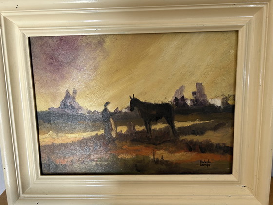 Adéntrese en un paisaje sereno con este cautivador cuadro de Robert Laorga. La obra capta con belleza un momento de tranquilidad, en el que una figura solitaria permanece de pie junto a un caballo sobre un fondo de tonos suaves y terrosos. El uso de cálidos marrones, naranjas y amarillos evoca una sensación de calma y nostalgia, que recuerda a un apacible campo al atardecer.