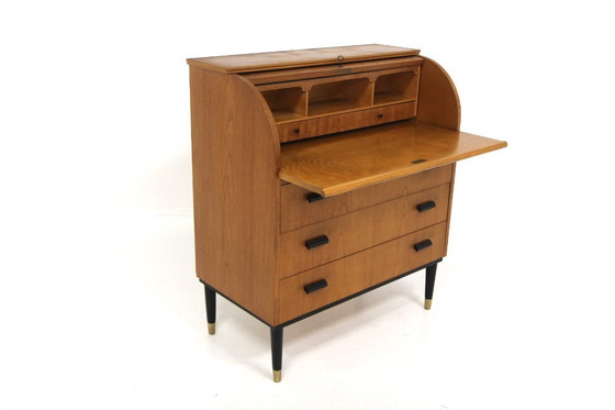 Escritorio de teca diseñado en Suecia en la década de 1950. Patas y tiradores de haya pintados de negro. En excelente estado, estable y con mínimas señales de uso. Conforme a su estado original. 25955.