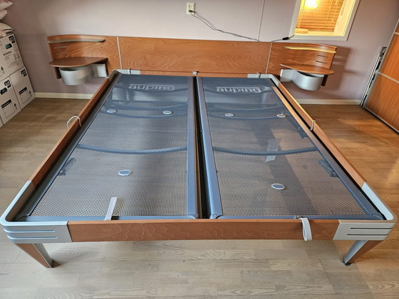 Serie de camas dobles Auping Next. Diseño de Ruud-Jan Jonker. Estructura de cama de 225 cm de largo y 185 cm de ancho. Compatible con colchones de 90 x 220 cm. Incluye dos compartimentos de almacenamiento giratorios. El colchón es regulable en altura, tanto en el respaldo como en los reposapiés. El reposapiés también está disponible en Whoppah. Es el mismo diseño y la misma serie.
