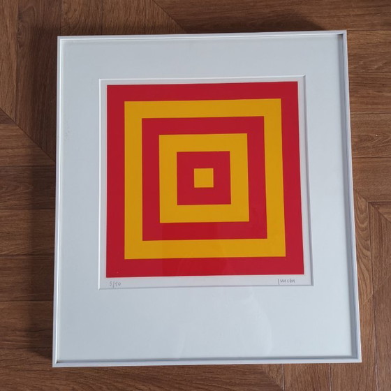 El marco mide 50,5 x 45,5 cm. La serigrafía (área coloreada) mide aproximadamente 30 x 30 cm.
