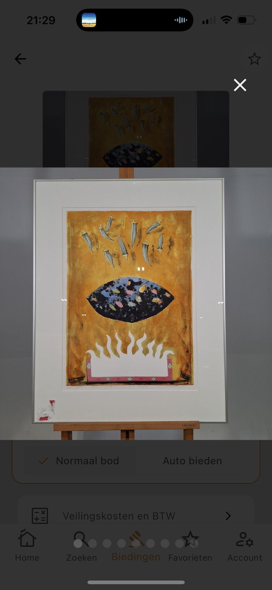Esta expresiva serigrafía de Lon Buttstedt exhibe un lenguaje visual poderoso y simbólico característico de su obra. En medio de una gama de colores cálidos y terrosos, se despliega una composición intrigante que fusiona elementos abstractos y figurativos. El motivo central —un ojo con estructuras en capas— evoca asociaciones con la percepción, el mundo interior y la conciencia, mientras que las formas ascendentes y los elementos en forma de llama en la parte inferior de la obra sugieren una sensación de energía y transformación.