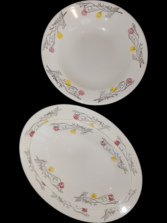 Dos fuentes ovaladas y tres platos hondos en cerámica art déco vintage de los años 50.