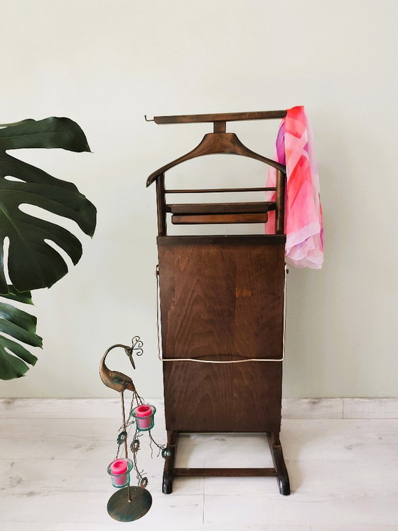 En el centro, se abre un pantalonero, revestido de tela azul y sujeto con pequeños clavos decorativos. Termina en un asiento o zapatero, típico del diseño italiano de los años 50-70.