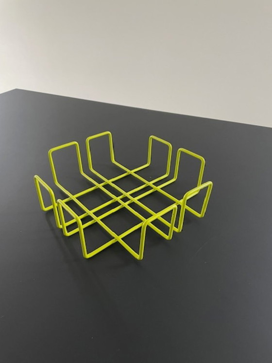 Un verdadero punto de atracción: este servilletero de diseño retro. Fabricado en alambre de acero revestido en verde lima. Dimensiones: 20 cm x 20 cm y 6 cm de alto. Presenta ligeros signos de desgaste y manchas en el revestimiento, pero apenas perceptibles. Por lo demás, ¡en perfecto estado!
