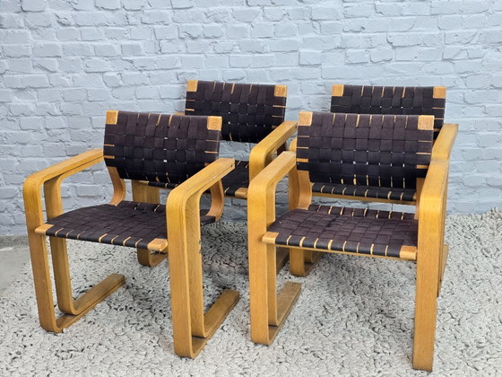 Set of four vintage design dining chairs designed by Magnus Olesen and manufactured by Durup in Denmark, dating from the late 1960s to early 1970s. The chairs feature distinctive bent plywood frames with softly rounded armrests and legs, reflecting the functional and material-driven approach of Scandinavian design from this period.The seats and backs are executed with woven straps, creating a rhythmic graphic surface while providing flexible seating comfort. The contrast between the warm plywood frames and the darker woven bands gives the chairs a calm and understated character.The woven straps show light wear and minor damage in places, consistent with age and use. Offered as a complete set of four, these chairs represent an honest and approachable example of Danish vintage design, suitable for everyday dining interiors. Dimensions: Height 76 Width 61 Depth 47 cm.