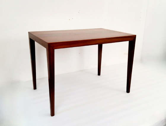 Mesa de centro vintage de Séverin Hansen, realizada en madera de palisandro con un veteado notable. Esta pieza única muestra ligeros signos de desgaste, acordes con su edad. Estampada bajo la tapa, refleja la artesanía escandinava y la elegancia atemporal del diseño de mediados de siglo. Ideal para los amantes de los muebles vintage y del interiorismo de alta gama.