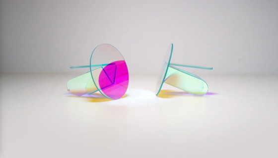 Este conjunto de dos esculturales mesas auxiliares ha sido diseñado por la internacionalmente galardonada diseñadora Patricia Urquiola, conocida por su enfoque poético de los materiales, el color y la forma. Con su estructura en capas y su acabado de cristal iridiscente, estas mesas son una oda a la luz y al movimiento.