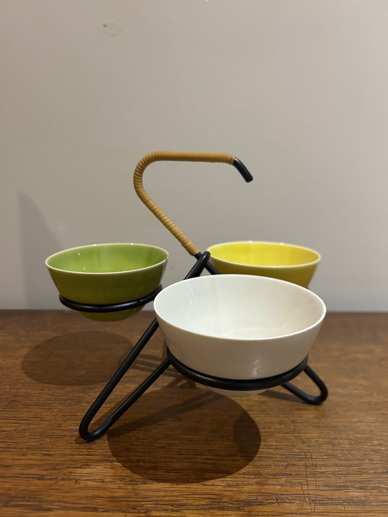 Excepcional carrito de servicio de metal lacado en negro con etiqueta original y tres cuencos, años 50/60. Laurids Lønborg.