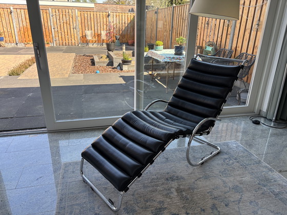Silla Chaise Longue MR, estilo Bauhaus, diseñada por Mies van der Rohe. Con una elegante estructura de acero inoxidable y un lujoso tapizado de cuero, esta edición de 1949 sigue siendo un icono atemporal del diseño moderno que ofrece estilo y comodidad. La silla se encuentra en buen estado y es ajustable en tres posiciones.