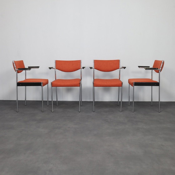 Juego de cuatro sillas de comedor de Thereca de la década de 1960, con un elegante diseño modernista. Las sillas combinan una esbelta estructura cromada con un cálido tapizado naranja, creando un llamativo contraste visual. Los reposabrazos de madera añaden un refinado acento natural. El conjunto ha sido completamente retapizado, ofreciendo comodidad y un aspecto fresco listo para muchos años de uso.