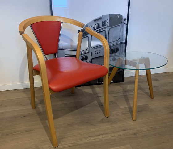 Esta silla es un diseño de Asger Jensen, una pieza vintage a menudo asociada con el modernismo danés de mediados de siglo. Este modelo en particular es conocido por su estructura escultural de haya laminada y el característico tubo de acero cromado que conecta los reposabrazos con el respaldo.