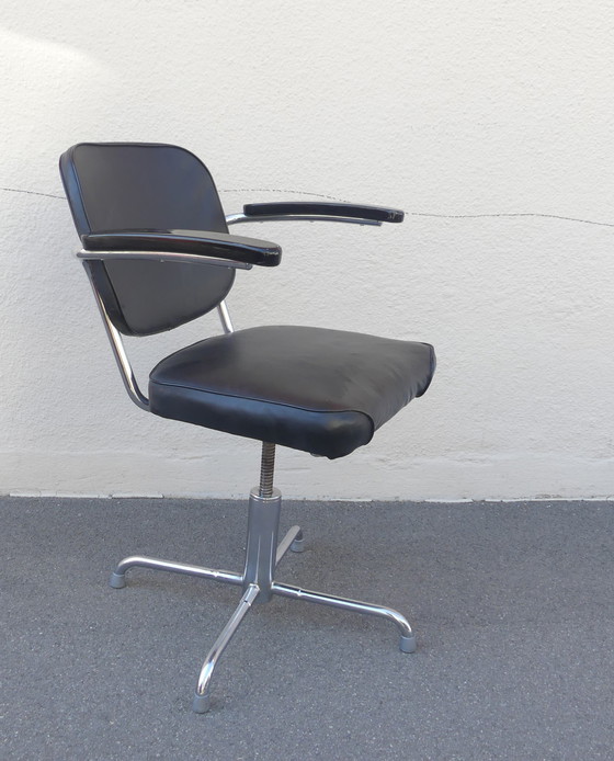 Silla de escritorio de Mucke Melder. Ancho aproximado: 60 cm, profundidad del asiento aproximada: 40 cm, altura del asiento regulable de forma continua desde aproximadamente 42 cm hasta aproximadamente 57 cm. Esta silla Art Déco fue fabricada por Mücke Melder (República Checa). Se encuentra en buen estado (ver fotos). Los reposabrazos de plástico están ligeramente desportillados en el borde delantero y las roscas están mínimamente desgastadas, lo que provoca un ligero tambaleo.
