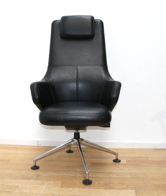 Silla de oficina de diseño con respaldo alto de Vitra. Estructura de metal cromado y asiento de cuero negro. Silla giratoria con ruedas. Altura del asiento: 50 cm. Reposacabezas regulable en altura. En excelente estado. Perfecta para todos tus espacios de trabajo.