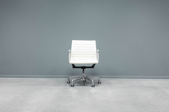 Tenemos 14 de estas sillas en stock. -Diseñador: Charles & Ray Eames -Productor: Herman Miller -Materiales: cuero blanco/estructura de aluminio pulido -Estado: ¡muy buen estado!