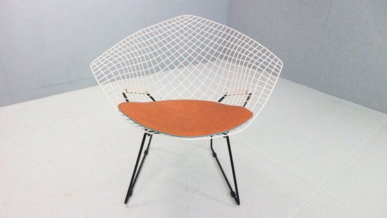 Silla Diamond de Harry Bertoia en metal blanco y negro y asiento de cuero nuevo