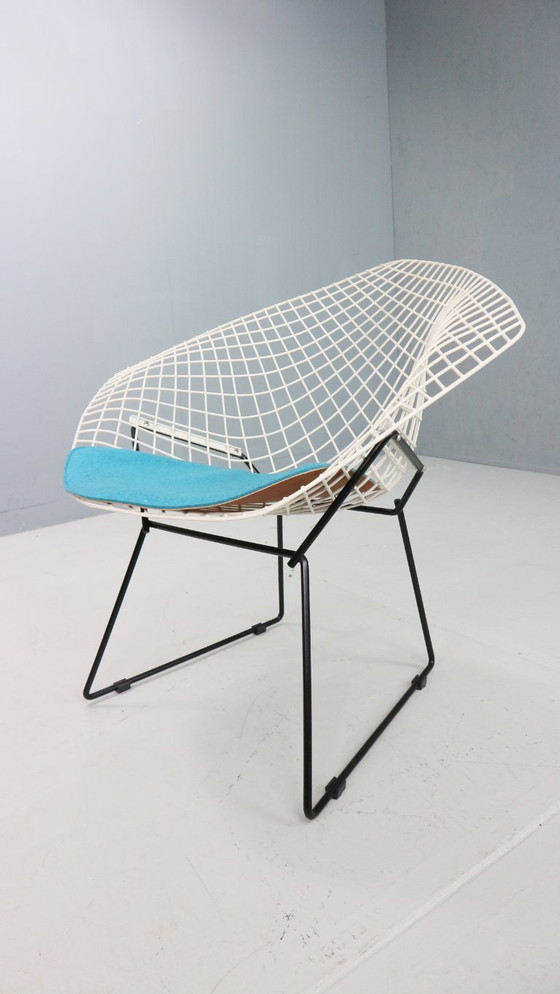 Silla Diamond de Harry Bertoia en metal blanco y negro y nuevo asiento azul años 60