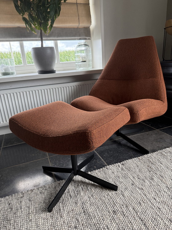 Esta moderna silla giratoria con reposapiés ofrece tanto estilo como comodidad. La silla está tapizada en una cálida tela textil de color marrón anaranjado y tiene una robusta base de metal. Su elegante diseño encaja perfectamente en interiores contemporáneos. Ideal para relajarse después de un largo día, con el apoyo añadido del reposapiés. Un excelente complemento para cualquier salón.