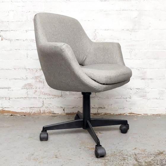 Sillón giratorio vintage de los años 60, también tapizado en tela gris. La base está pintada de negro y las ruedas son nuevas.