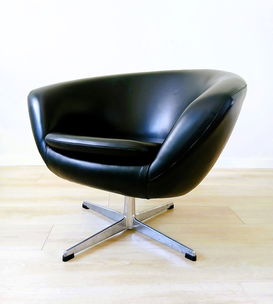 Silla giratoria Pod diseñada por Overman (Suecia ca. 1977) para Pastoe **** Cuero artificial con base de aluminio **** Gira perfectamente, tanto a la izquierda como a la derecha sin ruidos audibles **** Cojín de asiento de vinilo extraíble **** Peso ligero: solo 8 kg **** Dimensiones: An.: aprox. 83 cm **** Pr.: aprox. 67 cm **** Al.: aprox. 67 cm **** Al. del asiento: aprox. 44 cm **** Sobre el diseñador y su empresa: la empresa Overman todavía existe y fue fundada en 1948 por los hermanos Arne y Egon Overman. En las décadas de 1960 y 1970 diseñaron y produjeron, entre otros, para Wincrantz de Alemania y Pastoe (ver fotos del catálogo Goed Wonen de 1964).