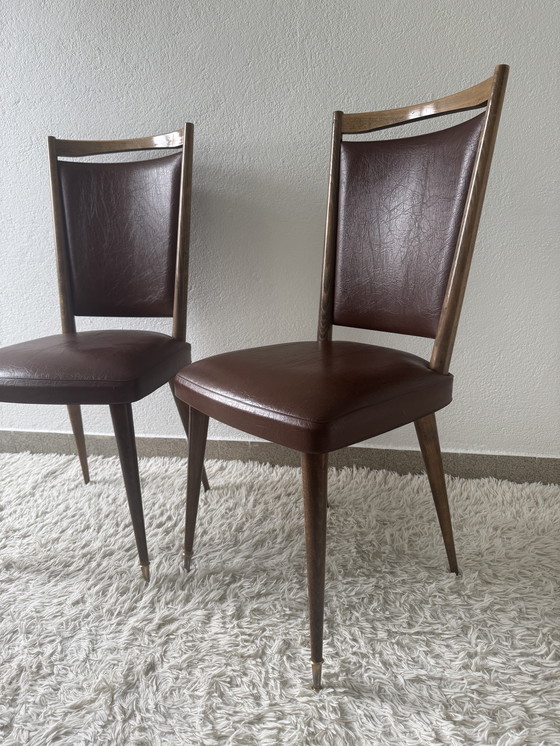 Preciosa pareja de sillas Baumann de los años 60/70 en estilo escandinavo en madera barnizada y skai marrón; muy buen estado general Alto: 95,2cm Alto asiento: 46cm Ancho: 42cm Fondo: 42cm (2 pares disponibles) / Precio por par de 2