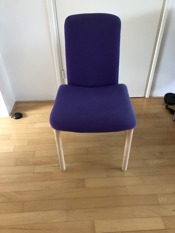1 silla está soldada y hay un poco de decoloración por la luz solar. Retapizado hace unos 15 años con tela Plough púrpura. Las patas son de fresno y azul oscuro