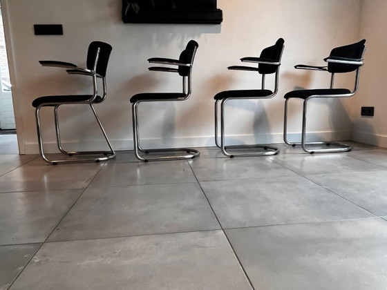 Se ofrece a la venta: un precioso conjunto de 4 sillas originales Gebroeders De Wit con estructura tubular.