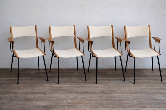 Conjunto de sillas de cuero de Gastone Rinaldi, Italia, década de 1970. Conjunto de sillas vintage diseñadas por Gastone Rinaldi, producidas en Italia en la década de 1970. Las sillas presentan un diseño modernista escultural con reposabrazos integrados y líneas limpias y arquitectónicas, características del diseño italiano de la época. Tapizadas en cuero en un tono cálido, bellamente envejecido con una pátina natural que añade profundidad y carácter. Las proporciones están bien equilibradas, ofreciendo comodidad y una presencia visual refinada. Adecuadas como sillas de comedor, sillas de escritorio o asientos decorativos. Un ejemplo atemporal y elegante del diseño italiano de mediados de siglo. Dimensiones (aprox.) • Ancho en los reposabrazos: 60 cm. • Ancho del asiento: 40,5 cm. • Profundidad del asiento: 41 cm. • Profundidad total: 46 cm. • Altura: 81 cm. • Altura del asiento: 43 cm. Estado. Buen estado vintage con pátina visible y ligeros signos de desgaste propios de su antigüedad y uso. Estructuralmente sólida.
