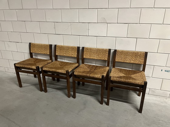 Juego de 4 sillas de comedor Martin Visser Spectrum en wengué con asiento de mimbre. ✅ Diseño de los años 60, auténticos clásicos del diseño ✅ Única ✅ En estado vintage usado: el mimbre y la madera necesitan un poco de cuidado, pero las sillas son robustas y muy prácticas. Dimensiones: • Alto: 72 cm • Ancho: 45 cm • Fondo: 43 cm • Altura del asiento: 45 cm. Diseño vintage de mediados de siglo, era espacial, diseñador, moderno, retro, madera, cincha, clásico, holandés, diseño holandés, ratán, años 60, sillas minimalistas, escandinavas.