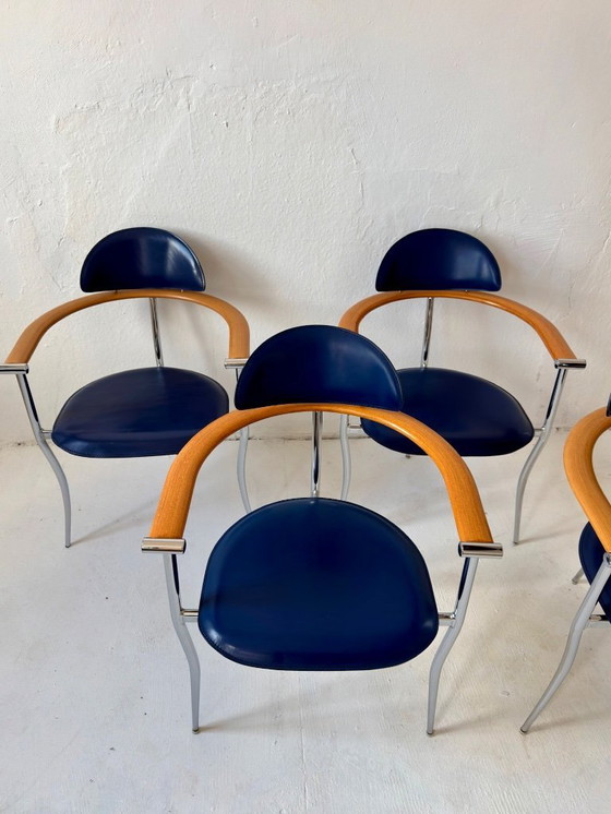 Estas cuatro elegantes sillas stiletto de Arrben están fabricadas en cuero azul de alta calidad y presentan una elegante estructura cromada. Los reposabrazos de madera aportan un toque cálido. Perfectas para espacios modernos o oficinas, ofrecen comodidad y un diseño atractivo. Esta versión en particular, con su atractiva combinación de colores y materiales, es difícil de encontrar hoy en día, lo que la convierte en una auténtica pieza de coleccionista. Las sillas son de segunda mano y, por lo tanto, presentan señales de uso, visibles en las fotos. Sin embargo, conservan su encanto y están listas para realzar su espacio.