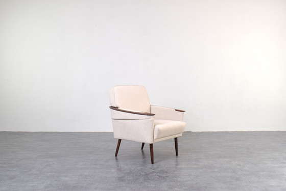 Este sillón se fabricó en Alemania en la década de 1960. Los reposabrazos son de madera maciza de roble y las patas de haya maciza se han restaurado profesional y cuidadosamente eliminando los revestimientos antiguos, tiñéndolos y barnizándolos. El sillón ha sido retapizado en color beige.