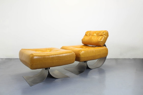 Fantástica e icónica butaca 'Alta' con reposapiés, diseñada por el arquitecto brasileño Oscar Niemeyer y fabricada por Mobilier International en Francia. Fabricada en acero con tapicería de cuero color mostaza, de la década de 1970.