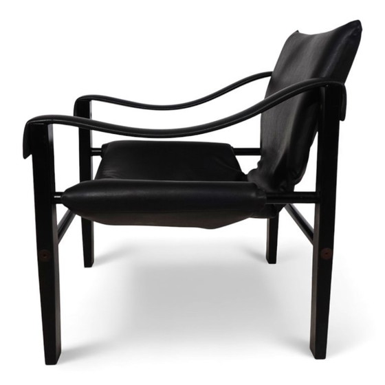 Un popular sillón safari de Maurice Burke, presentado en excelente estado vintage. El asiento, tapizado en piel sintética negra de alta calidad, está suspendido sobre elegantes puntales metálicos lacados en negro y prácticamente no muestra signos de desgaste. La flexibilidad del asiento y su robusta construcción proporcionan una comodidad excepcional. La estructura de madera negra complementa a la perfección el cuero negro, confiriéndole al sillón su sofisticada estética de mediados de siglo. Solo los puntales metálicos y los tornillos presentan un ligero desgaste propio del paso del tiempo, lo que realza su auténtico encanto.