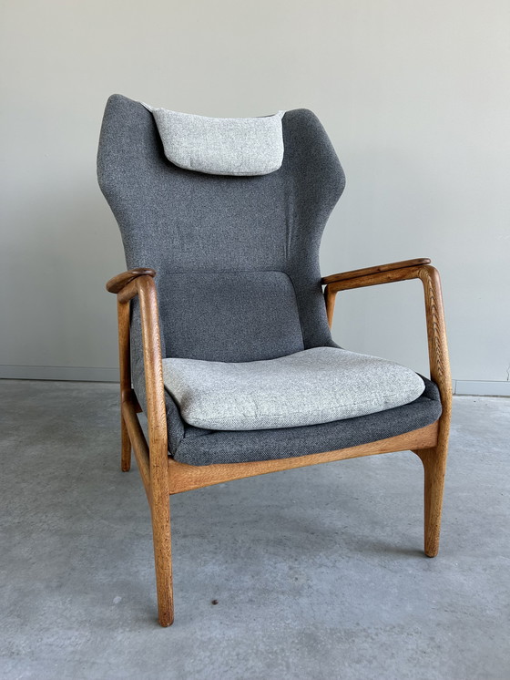 ¡Una auténtica pieza de coleccionista! Sillón Bovenkamp, diseñado por Arnold Madsen y Henry Schubell para la empresa de muebles holandesa Bovenkamp en la década de 1960. Los reposabrazos se extienden con elegancia tras el respaldo. Otra característica destacada de este diseño orgánico es la madera bicolor utilizada: roble y teca. Este sillón ha sido retapizado recientemente, por lo que se encuentra en muy buen estado. Dimensiones: Alto x Ancho x Fondo = 100 x 67 x 74 cm y la altura del asiento es de 41 cm. Colores: antracita, gris y color madera. Marca: Bovenkamp (ver foto). Tengo dos sillones, así que los vendo en conjunto.