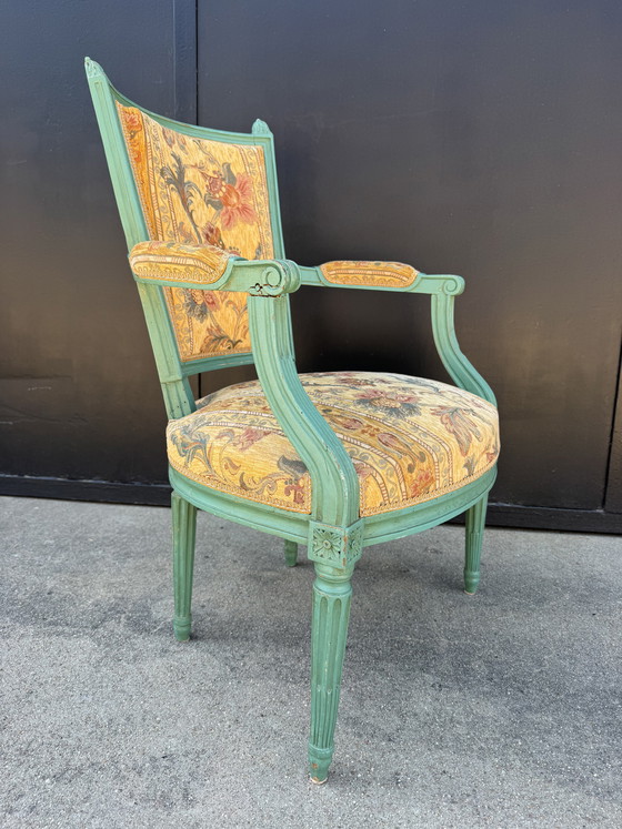Encantador sillón estilo Luis XVI (Francia, siglo XVIII) en colores frescos; la estructura está pintada en un verde turquesa claro y probablemente fue retapizada en la década de 1960 con terciopelo floral; buen estado general (pátina y algunas marcas en la estructura, pero un asiento muy cómodo y robusto).