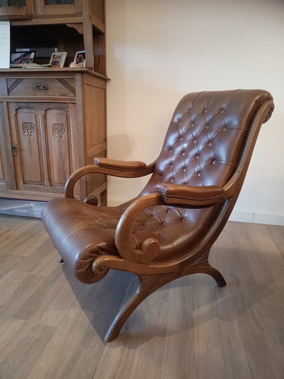 Experimente la elegancia atemporal de este sillón Chesterfield, una obra maestra de la artesanía que añade un toque de distinción a cualquier estancia. Su elegante tapizado de cuero marrón irradia lujo y ofrece una cómoda experiencia de asiento, mientras que los detalles de madera realzan el encanto clásico del diseño.