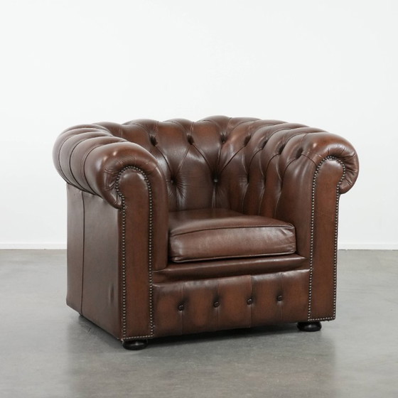 Se subasta este magnífico sillón Chesterfield de estilo inglés en piel de vaca marrón, con un acabado de tachuelas decorativas.