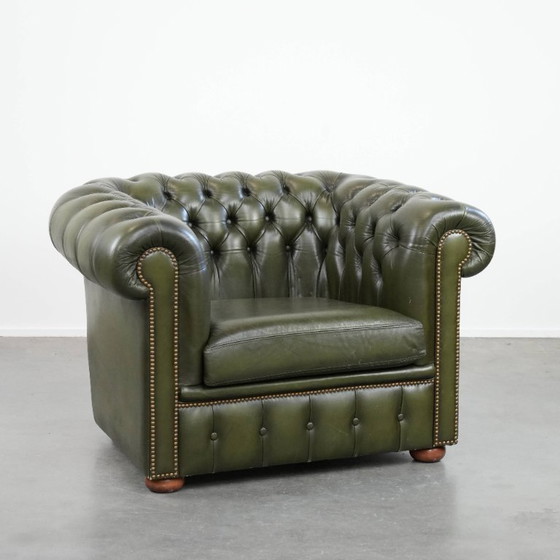 Se subasta este precioso sillón Chesterfield verde de estilo inglés, fabricado en piel de vaca, con un clásico acabado tachonado.