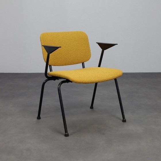 Este sillón ha sido completamente retapizado en un rico tejido bouclé amarillo dorado, aportando un contraste cálido y contemporáneo a su estructura industrial minimalista. La base de metal negro está en excelente estado original, y presenta los icónicos reposabrazos triangulares que le dan un atrevido toque brutalista.