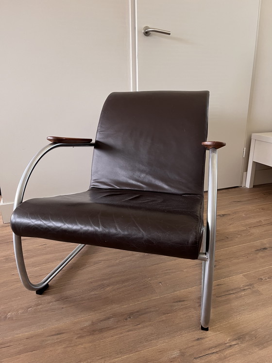 Precioso sillón Harvink Deining de cuero con armazón tubular y reposabrazos de madera de teca.