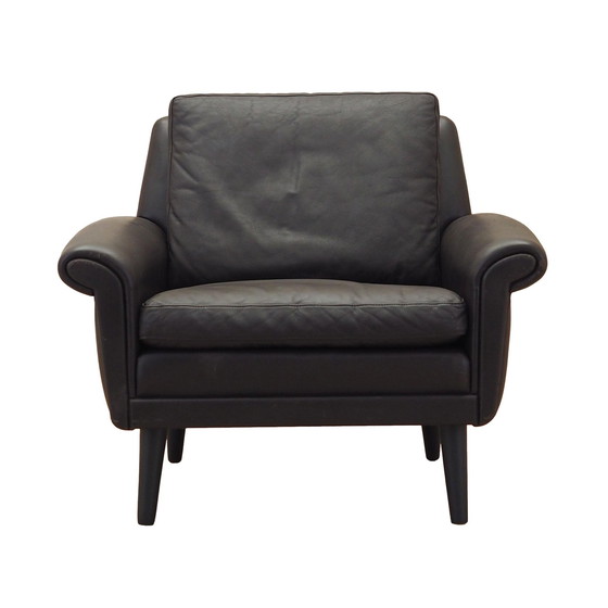 Este sillón se fabricó en la década de 1960 en la prestigiosa fábrica danesa Erhardsen & Andersen. Diseñado por el icono del diseño danés Aage Christensen, conserva su cuero original. La tapicería es marrón y se ha utilizado cuero natural de alta calidad. El sillón complementará a la perfección el sofá, que se puede adquirir por separado. Estado: Tapicería original en buen estado, con signos normales de uso visibles. Las marcas de uso más visibles se muestran siempre en las fotos. Producto listo para usar. Datos técnicos: altura: 78 cm, anchura: 90 cm, profundidad: 83 cm, altura del asiento: 40 cm, dimensiones del asiento: 56 x 50 cm.