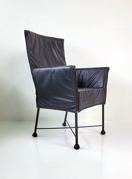 Diseño de Gerard van den Berg. Cuero negro e interior en perfecto estado. Dimensiones: ancho x profundidad x altura: 60 x 60 x 98 cm. Altura del asiento: 46 cm. Altura del reposabrazos: 66 cm.