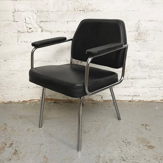 Sillón vintage de la era espacial de los años 70 en su estado original. Estructura de metal cromado y tapizado de polipiel negra.