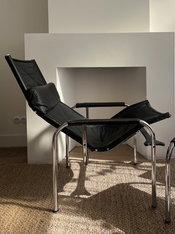Strässle, Hans Eichenberger, HE1106, HE1104, sillón, sillón vintage, silla de diseño, estilo moderno de mediados de siglo, Bauhaus, diseño suizo, cromo, silla de cuero, otomana, década de 1970, clásico del diseño