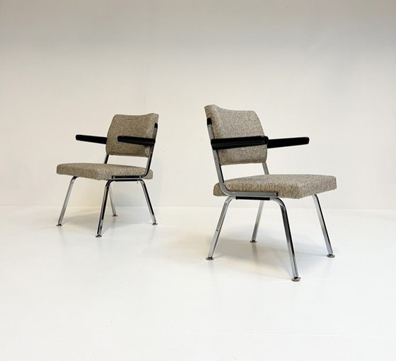 Este sillón industrial no solo luce genial, sino que también es increíblemente cómodo. Atribuido a Gispen, década de 1960. El sillón tiene un interior nuevo y ha sido retapizado con una resistente tela gris. Cuenta con reposabrazos y se apoya sobre deslizadores flexibles. Hay dos sillas en stock y se venden por separado. El precio es por sillón.