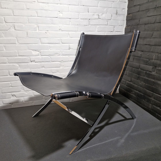 El nuevo cuero negro, sujeto por cilindros laterales, reposa sobre una estructura en X de acero cromado y es excepcionalmente cómodo.