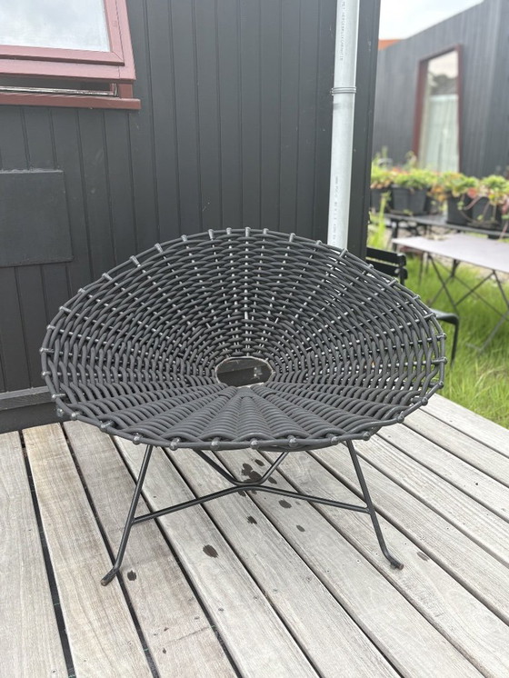 El sillón Sweet 27 fue diseñado por Paola Navone para la firma italiana de diseño Gervasoni. Su diseño se basa en la clásica silla de mimbre. Esta silla redonda cuenta con una estructura de metal y un asiento de PVC tejido. Mide 101 cm de ancho, 71 cm de alto, 80 cm de profundidad y una altura de asiento de 37 cm. Ha sido usado y ha permanecido en el jardín durante varios años. Presenta algunas manchas de óxido, principalmente en la sección central.